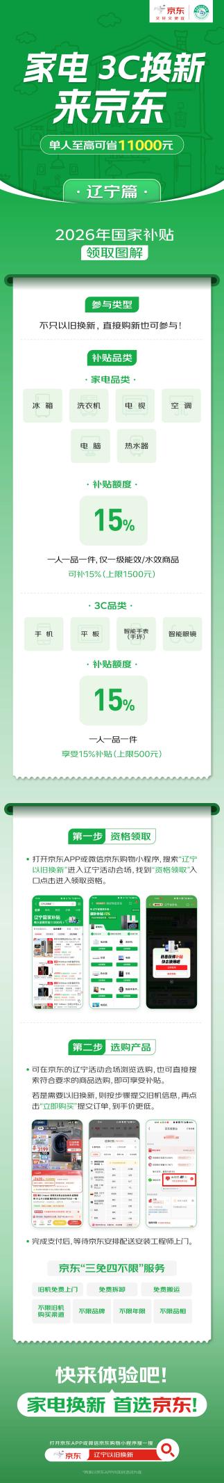 目前,辽宁国补已上线京东,想换新家电及3C数码的辽宁消费者,即日起打开京东APP搜索“辽宁以旧换新”,领国补,选购心仪好物。